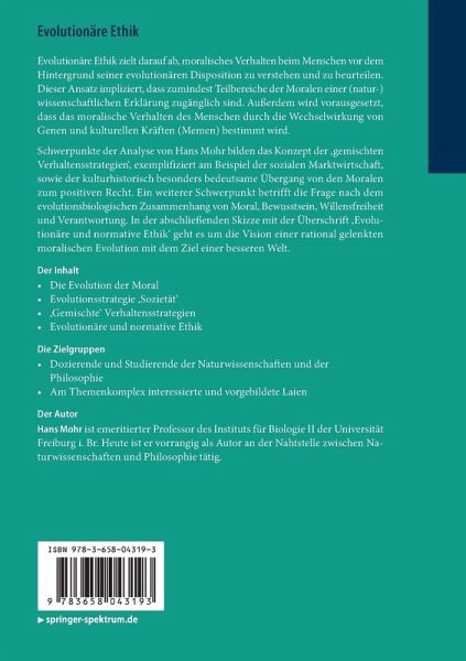Evolutionäre Ethik zielt darauf ab, moralisches Verhalten beim Menschen vor dem Hintergrund seiner evolutionären Disposition zu verstehen und zu beurteilen. Dieser Ansatz impliziert, dass zumindest Teilbereiche der Moralen einer (natur-)wissenschaftlichen Erklärung zugänglich sind. Außerdem wird vorausgesetzt, dass das moralische Verhalten des Menschen durch die Wechselwirkung von Genen und kulturellen Kräften (Memen) bestimmt wird. Schwerpunkte der Analyse von Hans Mohr bilden das Konzept der 'gemischten Verhaltensstrategien', exemplifiziert am Beispiel der sozialen Marktwirtschaft, sowie der kulturhistorisch besonders bedeutsame Übergang von den Moralen zum positiven Recht. Ein weiterer Schwerpunkt betrifft die Frage nach dem evolutionsbiologischen Zusammenhang von Moral, Bewusstsein, Willensfreiheit und Verantwortung. In der abschließenden Skizze mit der Überschrift 'Evolutionäre und normative Ethik' geht es um die Vision einer rational gelenkten moralischen Evolution mit dem Ziel einer besseren Welt.