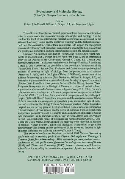 This collection of twenty-two research papers explores the creative interaction between evolutionary and molecular biology, philosophy, and theology. It is the result of the third of five international research conferences co-sponsored by the Vatican Observatory, Rome and the Center for Theology and the Natural Sciences, Berkeley. The over arching goal of these conferences is to support the engagement of constructive theology with the natural sciences and to investigate the philosophical and theological elements in ongoing theoretical research in the natural sciences. Contents: An extensive introduction (Robert John Russell), two recent statements on evolution and Christian faith by Pope John Paul II, and an interpretive essay by the Director of the Observatory, George V. Coyne, S. J., Section One: Scientific Background-evolutionary and molecular biology (Francisco J Ayala and Camilo J. Cela-Conde) and the possibility of the evolution of extraterrestrial life (Julian Chela-Flores); Section Two: Evolution and Divine Action-philosophical analyses of teleology in light of biology from the perspectives of a scientist (Francisco J. Ayala) and a theologian (Wesley J. Wildman), assessments of the evidence for teleology by scientists (Paul Davies and William R. Stroeger, S. J.), and theological arguments on divine action and evolution focusing on special providence (Robert John Russell) and on process theism (Charles Birch); Section Three: Religious Interpretations of Biological Themes-critique of evolution-based arguments for atheism and of science-based religion (George F. R. Ellis), Darwin's relation to natural theology and a feminist perspective on metaphors in evolution (Anne M. Clifford), evolution from a naturalist perspective and the challenge to religion (Willem B. Drees), bicultural evolution and the created co-creator (Philip Hefner), continuity and emergence, propensities, pain, and death in light of evolution, and constructive Christology from and Anglican perspective (Arthur Peacocke), original sin and saving grace in light of evolution from a trinitarian perspective (Denis Edwards), divine kenosis and the power of the future from an evolutionary and process perspective (John F. Haught), and a comparison of models of God in light of evolution (Ian G. Barbour); Section Four: Biology, Ethics, and the Problem of Evil-an evolutionary model of biological and moral altruism (Camilo J. Cela-Conde and Gisele Marty), supervenience as a response to the reduction of Morality to biology (Nancey Murphy), ethical and theological issues raised by gem-line genetic therapy (Ted Peters), and the problems of divine action and theodicy in light of human sinfulness and suffering in nature (Thomas F. Tracy). This series of conferences builds on the initial 1987 Vatican Observatory conference and its resulting publication, Physics, Philosophy and Theology: A Common Quest for Understanding (1988), and on the previous Jointly-sponsored conferences and their publications, Quantum Cosmology and the Laws of Nature (1993) and Chaos and Complexity (1995). Future conferences will focus on scientific topics including the neuroscience's, quantum physics, and quantum field theory.