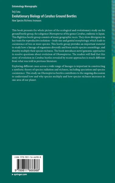 This book presents the whole picture of the ecological and evolutionary study on the ground beetle group, the subgenus Ohomopterus of the genus Carabus, endemic to Japan. This flightless beetle group consists of many geographic races. They show divergence in key traits for reproductive isolation-body size and genital morphology, which leads to coexistence of two or more species. This beetle group provides an important material to study how a lineage of organisms diversify and form multi-species assemblage, and thereby multiply their species richness. The book introduces novel genomic approaches to resolve questions about evolution of Ohomopterus. The readers will find that this story of evolution in Carabus beetles revealed by recent approaches is much different from what was told in previous literature.