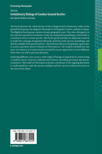 This book presents the whole picture of the ecological and evolutionary study on the ground beetle group, the subgenus Ohomopterus of the genus Carabus, endemic to Japan. This flightless beetle group consists of many geographic races. They show divergence in key traits for reproductive isolation-body size and genital morphology, which leads to coexistence of two or more species. This beetle group provides an important material to study how a lineage of organisms diversify and form multi-species assemblage, and thereby multiply their species richness. The book introduces novel genomic approaches to resolve questions about evolution of Ohomopterus. The readers will find that this story of evolution in Carabus beetles revealed by recent approaches is much different from what was told in previous literature.