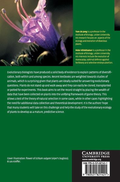 1. Optimisation models; 2. Investments, returns and proportionality; 3. Gain curves: efficiency factors; 4. Evolutionary stable strategies: sex allocation strategies as an example; 5. Size at flowering; 6. Reproductive effort; 7. Size and number trade-offs: the evolution of seed size; 8. Sex allocation theory for partially selfing plants; 9. Size dependent sex allocation; 10. Sex ratios in dioecious plants; 11. Outcrossing, selfing or no sex at all(?)33;; 12. Heterostyly; 13. Selective embryo abortion; 14. Attractiveness to pollinators; 15. Parent-offspring conflict; 16. Intragenomic conflict; 17. Group and kin selection; Appendix 1. Mathematical help; References.