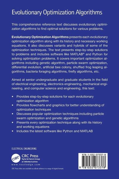 The text covers evolutionary optimizing algorithms with the help of MATLAB and Python programming in a comprehensive manner. It will be an ideal reference text for readers in diverse engineering fields including electrical, electronics and communication, computer science and mechanical engineering.