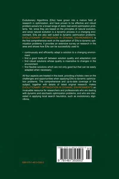 Evolutionary Algorithms (EAs) have grown into a mature field of research in optimization, and have proven to be effective and robust problem solvers for a broad range of static real-world optimization problems. Yet, since they are based on the principles of natural evolution, and since natural evolution is a dynamic process in a changing environment, EAs are also well suited to dynamic optimization problems. Evolutionary Optimization in Dynamic Environments is the first comprehensive work on the application of EAs to dynamic optimization problems. It provides an extensive survey on research in the area and shows how EAs can be successfully used to