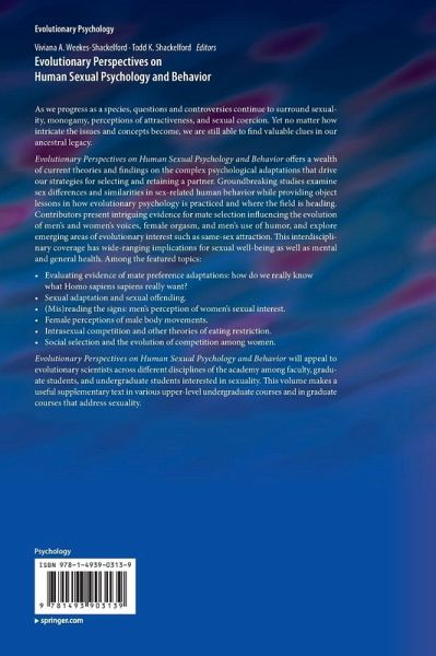 Section 1: Introduction to Evolutionary Perspectives on Human Sexual Psychology and Behavior.- Evaluating Evidence of Mate Preference Adaptations: How Do We Really Know What Homo sapiens sapiens Really Want?.- Section 2: Sexual Adaptations in Men.- Adaptation and sexual offending.- Sexual selection on human voices.- Agreement and individual differences in men's preferences for women's facial characteristics.- Male adaptations to female ovulation.- (Mis)reading the signs: Men's perception of women's sexual interest.- Bodily Attractiveness as a Window to Women's Fertility and Reproductive Value.- Social and environmental conditions intensifying male competition for resources, status, and mates lead to increased male mortality.- Male production of humor produced by sexually selected psychological adaptations.- Male adaptations to retain a mate.- Section 3: Sexual Adaptations in Women.- Evolutionary psychology and rape avoidance .- Female orgasm.- Female adaptations to ovulation.- Women's preferences for male facial features.- Women's disgust adaptations.- Female Perceptions of Male Body Movements.- Intrasexual Competition and other Theories of Eating Restriction.- Attractiveness and rivalry in women's same-sex friendships.- Section 4: Conclusions and Future Directions for Evolutionary Perspectives on Human Sexual Psychology and Behavior.- Evolutionary perspectives on homosexual psychology and behavior.- Reflections on the Evolution of Human Sex Differences: Social Selection and the Evolution of Competition among Women.
