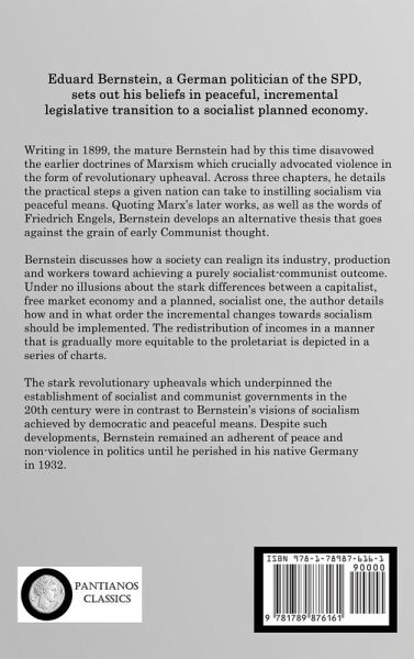 Eduard Bernstein, a German politician of the socialist party, sets out his beliefs in peaceful, incremental legislative transition to a socialist planned economy. Writing in 1899, the mature Bernstein had by this time disavowed the earlier doctrines of Marxism which crucially advocated violence in the form of revolutionary upheaval. Across three chapters, he details the practical steps a given nation can take to instilling socialism via peaceful means. Quoting Marx's later works, as well as the words of Friedrich Engels, Bernstein develops an alternative thesis that goes against the grain of early Communist thought. Bernstein discusses how a society can realign its industry, production and workers toward achieving a purely socialist-communist outcome. Under no illusions about the stark differences between a capitalist, free market economy and a planned, socialist one, the author details how and in what order the incremental changes towards socialism should be implemented. The redistribution of incomes in a manner that is gradually more equitable to the proletariat is depicted in a series of charts. The stark revolutionary upheavals which underpinned the establishment of socialist and communist governments in the 20th century were in contrast to Bernstein's visions of socialism achieved by democratic and peaceful means. Despite such developments, Bernstein remained an adherent of peace and non-violence in politics until he perished in his native Germany in 1932.