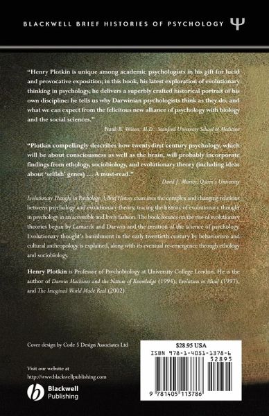 "Plotkin gives an erudite and engaging account of theintellectual currents that influenced the relationship betweenpsychology and evolutionary thought over the past 100years.....Interspersed throughout are interesting anecdotes,colorful descriptions of personalities, and accounts of twists offate that affected careers and influenced the history ofpsychology....For any psychologist interested in the history ofideas -and how intellectual currents, politics and chance eventscan affect scientific paradigms-it is a must read. It's lastingvalue is that it provides a lucid and well-documented hisotry ofthe intellectually shameful exculsion of evolutionary thought inpsychological theory during most of the 20th century. Thankfully,that exclusion is being remedied in the 21st century." PersonnelPsychology, Summer 2005