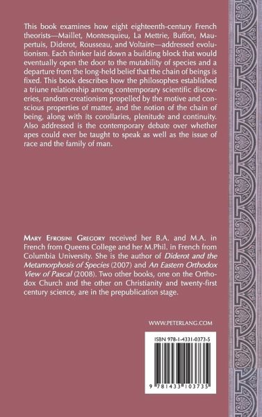 This book examines how eight eighteenth-century French theorists - Maillet, Montesquieu, La Mettrie, Buffon, Maupertuis, Diderot, Rousseau, and Voltaire - addressed evolutionism. Each thinker laid down a building block that would eventually open the door to the mutability of species and a departure from the long-held belief that the chain of beings is fixed. This book describes how the philosophes established a triune relationship among contemporary scientific discoveries, random creationism propelled by the motive and conscious properties of matter, and the notion of the chain of being, along with its corollaries, plenitude and continuity. Also addressed is the contemporary debate over whether apes could ever be taught to speak as well as the issue of race and the family of man.