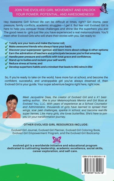 Hey Awesome Girl! School life can be difficult at times, right? Girl drama, friend pressure, family conflicts, academic struggles-I get it. But fear not! Evolved Girl is here to help you conquer those challenges and shine like the superhero you are! The good news is-Evolved Girl has already helped girls just like you. You'll also meet other Evolved Girls who will share their stories and tips with you. You'll learn how to: Totally ace your tests and make the honor roll; Make awesome friends who always have your back; Explore exciting career ideas and take action now to get ready Earn the admiration of teachers and principals because you're that amazing. Handle peer pressure and conflicts with total grace and confidence. Stand up to bullies and reclaim your self-worth Reduce stress at home. Develop superhero habits and a mindset that leads to BIG wins in life! Each chapter provides an opportunity for students to learn, reflect, and grow. Overall, students will gain life skills to help them experience a win. They'll discover how to set goals and achieve them. This is a must read for every school girl. (Ages 9-14).