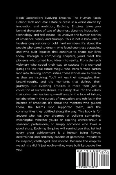 Book Description: Evolving Empires: The Human Faces Behind Tech and Real Estate Success In a world driven by innovation and ambition, Evolving Empires takes you behind the scenes of two of the most dynamic industries-technology and real estate-to uncover the human stories of resilience, vision, and triumph. This is not a book about faceless corporations or cold, hard numbers. It's about the people who dared to dream, who faced countless obstacles, and who built legacies that continue to shape our lives today. Through 12 compelling chapters, you'll meet the pioneers who turned bold ideas into reality. From the tech visionary who coded their way to success in a cramped garage to the real estate mogul who transformed barren land into thriving communities, these stories are as diverse as they are inspiring. You'll witness their struggles, their breakthroughs, and the moments that defined their journeys. But Evolving Empires is more than just a collection of success stories. It's a deep dive into the values that drive true leadership-resilience in the face of failure, collaboration in the pursuit of innovation, and ethics in the balance of ambition. It's about the mentors who guided them, the teams who supported them, and the communities they uplifted along the way. This book is for anyone who has ever dreamed of building something meaningful. Whether you're an aspiring entrepreneur, a seasoned professional, or simply someone who loves a good story, Evolving Empires will remind you that behind every great achievement is a human being-flawed, determined, and endlessly capable of greatness. Prepare to be inspired, challenged, and moved. Because the empires we admire didn't just evolve-they were built by people like you.