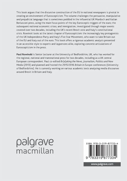 This book argues the discursive construction of the EU in national newspapers is pivotal in creating an environment of Euroscepticism. It will challenge the persuasive, manipulative and prejudicial language, sometimes peddled in the influential UK Murdoch and Italian Berlusconi press. The foci are the key Eurosceptic triggers of the euro; the subsequent national economic crises; and immigration, investigated through major events covered over two decades, including the UK's recent Brexit vote.