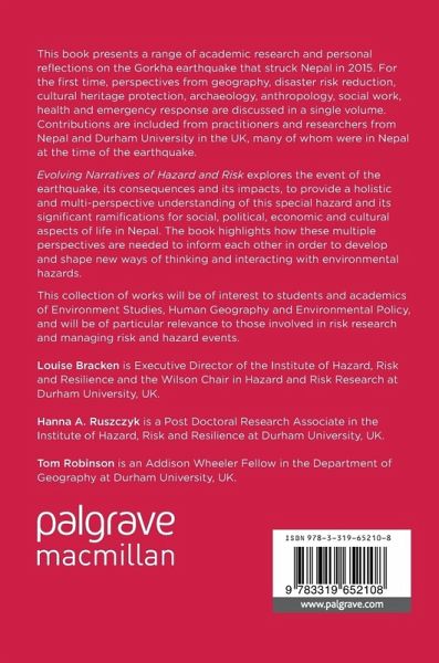 Evolving Narratives of Hazard and Risk explores the event of the earthquake, its consequences and its impacts, to provide a holistic and multi-perspective understanding of this special hazard and its significant ramifications for social, political, economic and cultural aspects of life in Nepal. The book highlights how these multiple perspectives are needed to inform each other in order to develop and shape new ways of thinking and interacting with environmental hazards.
