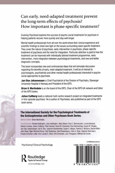 Can early, need-adapted treatment prevent the long-terms effects of psychosis? How important is phase-specific treatment? Evolving Psychosis explores the success of psycho-social treatments for psychosis in helping patients recover more quickly and stay well longer. Mental health professionals from all over the world share their clinical experience and scientific findings to shed new light on the issues surrounding need-specific treatment. They cover: The Nature of Psychosis, Early Intervention in Psychosis, Phase-Specific Treatment of Psychosis and The Need for Integration. Particular attention is paid to the how treatment can be improved with individually tailored treatment programmes, early intervention, more integration between psychological treatments, and new and better diagnostic concepts. This book incorporates new and controversial ideas which will stimulate discussion regarding the benefits of early, need-adapted treatment. It will be of interest to psychologists, psychiatrists and other mental health professionals interested in psycho-social approaches to psychosis.