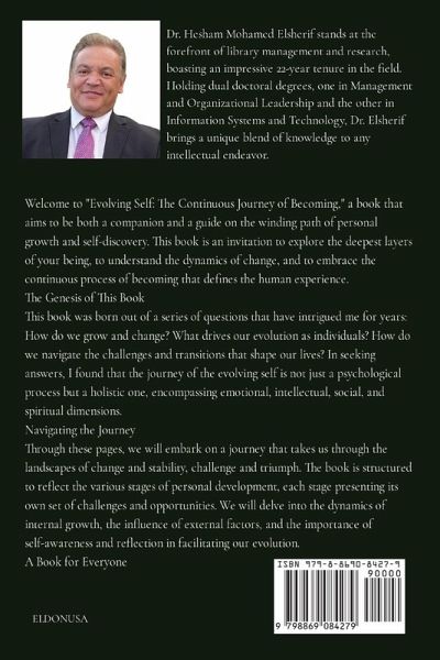 Welcome to "Evolving Self: The Continuous Journey of Becoming," a book that aims to be both a companion and a guide on the winding path of personal growth and self-discovery. This book is an invitation to explore the deepest layers of your being, to understand the dynamics of change, and to embrace the continuous process of becoming that defines the human experience. The Genesis of This Book This book was born out of a series of questions that have intrigued me for years: How do we grow and change? What drives our evolution as individuals? How do we navigate the challenges and transitions that shape our lives? In seeking answers, I found that the journey of the evolving self is not just a psychological process but a holistic one, encompassing emotional, intellectual, social, and spiritual dimensions. Navigating the Journey Through these pages, we will embark on a journey that takes us through the landscapes of change and stability, challenge and triumph. The book is structured to reflect the various stages of personal development, each stage presenting its own set of challenges and opportunities. We will delve into the dynamics of internal growth, the influence of external factors, and the importance of self-awareness and reflection in facilitating our evolution. A Book for Everyone Whether you are at a crossroads in life, seeking to understand past experiences, or simply curious about the nature of personal growth, this book is for you. It is written for those who aspire to a deeper understanding of themselves and for those who seek to foster growth in others - be it as parents, educators, mentors, or leaders. A Personal Invitation As you read "Evolving Self: The Continuous Journey of Becoming," I encourage you to engage with the content actively. Reflect on your experiences, question your beliefs, and consider new perspectives. This book is not just a collection of ideas but a starting point for introspection and dialogue - with yourself and with the world around you. In Conclusion The journey of the evolving self is endless and ever-changing. It is my hope that this book serves as a valuable resource and a source of inspiration as you navigate the complexities and the beauties of your personal journey of becoming. With warm regards, Dr. Hesham Mohamed Elsherif