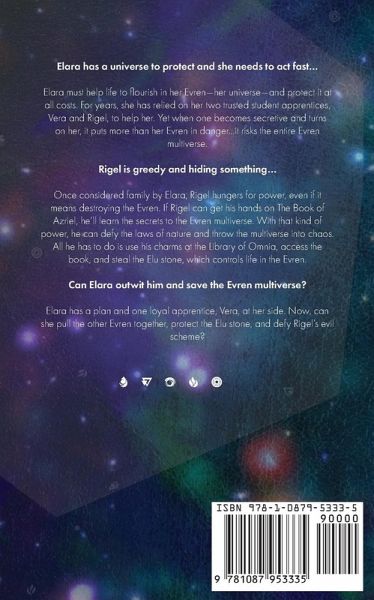 Elara has a universe to protect and she needs to act fast... Elara must help life to flourish in her Evren-her universe-and protect it at all costs. For years, she has relied on her two trusted student apprentices, Vera and Rigel, to help her. Yet when one becomes secretive and turns on her, it puts more than her Evren in danger...it risks the entire Evren multiverse. Rigel is greedy and hiding something... Once considered family by Elara, Rigel hungers for power, even if it means destroying the Evren. If Rigel can get his hands on The Book of Azriel, he'll learn the secrets to the Evren multiverse. With that kind of power, he can defy the laws of nature and throw the multiverse into chaos. All he has to do is use his charms at the Library of Omnia, access the book, and steal the Elu stone, which controls life in the Evren. Can Elara outwit him and save the Evren multiverse? Elara has a plan and one loyal apprentice, Vera, at her side. Now, can she pull the other Evren together, protect the Elu stone, and defy Rigel's evil scheme?