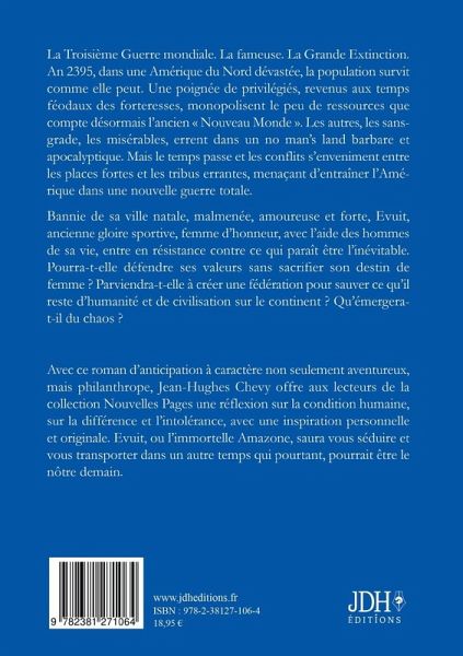 La Troisième Guerre mondiale. La fameuse. La Grande Extinction. An 2395, dans une Amérique du Nord dévastée, la population survit comme elle peut. Une poignée de privilégiés, revenus aux temps féodaux des forteresses, monopolisent le peu de ressources que compte désormais l¿ancien « Nouveau Monde ». Les autres, les sans-grade, les misérables, errent dans un no man¿s land barbare et apocalyptique. Mais le temps passe et les conflits s¿enveniment entre les places fortes et les tribus errantes, menaçant d¿entraîner l¿Amérique dans une nouvelle guerre totale. Bannie de sa ville natale, malmenée, amoureuse et forte, Evuit, ancienne gloire sportive, femme d¿honneur, avec l¿aide des hommes de sa vie, entre en résistance contre ce qui paraît être l¿inévitable. Pourra-t-elle défendre ses valeurs sans sacrifier son destin de femme¿? Parviendra-t-elle à créer une fédération pour sauver ce qüil reste d¿humanité et de civilisation sur le continent ? Qüémergera-t-il du chaos ? Avec ce roman d¿anticipation à caractère non seulement aventureux, mais philanthrope, Jean-Hughes Chevy offre aux lecteurs de la collection Nouvelles Pages une réflexion sur la condition humaine, sur la différence et l¿intolérance, avec une inspiration personnelle et originale. Evuit, ou l¿immortelle Amazone, saura vous séduire et vous transporter dans un autre temps qui pourtant, pourrait être le nôtre demain.