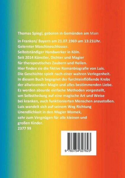 Hier finden sie die fiktive Romanbiografie von Luis. Die Geschichte spielt nach einer wahren Verlegenheit. In diesem Buch begegnet der furchteinflößende Krebs der allwissenden Magie und alles bestimmenden Liebe. Es werden absurde einfache Methoden vorgestellt, um Selbstheilung auf eine magische Art und Weise bei kranken, auch funktionierten Menschen anzustoßen. Luis wandelt sich auf seinem Weg Richtung Unendlichkeit in den Magier Momek, sehr zum Vergnügen für alle kleinen und großen Kinder. 2377 99
