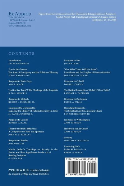 CONTENTS: Introduction Klyne Snodgrass Fear in the Garden: The State of Emergency and the Politics of Blessing Scott Bader-Saye Response to Bader-Saye Amy E. Black ""In God We Trust""? The Challenge of the Prophets R. W. L. Moberly Response to Moberly Robert L. Hubbard, Jr. Imagining the Unthinkable: Exposing the Idolatry of National Security in Amos M. Daniel Carroll R. Response to Carroll Robert D. Haak Security and Self-Sufficiency: A Comparison of Paul and Epictetus John M. G. Barclay Response to Barclay Joel Willitts Martin Luther's Teachings on Security in the Psalms and Their Significance for the Art of Reading Scripture G. Sujin Pak Response to Pak Jo Ann Deasy ""One Who Trusts Will Not Panic"": Providence and the Prophet of Desecuritization Jill Carson Colwell Response to Colwell Darrell Cosden The Radical Insecurity of Idolatry? Or of Faith? Randall C. Zachman Response to Zachmann Kyle J. A. Small Homeland Insecurity: The Spiritual Lust for an Escape Clause Ben Witherington III Response to Witherington Andy Johnson Hoofbeats Full of Grace? Andy Johnson Security William H. Willimon Protecting God: Psalm 91, Luke 4:1-14 Brent Laytham
