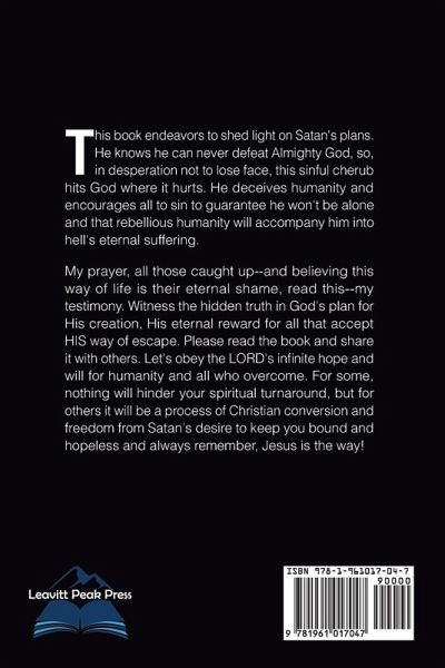 This book endeavors to shed light on Satan's plans. He knows he can never defeat Almighty God, so, in desperation not to lose face, this sinful cherub hits God where it hurts. He deceives humanity and encourages all to sin to guarantee he won't be alone and that rebellious humanity will accompany him into hell's eternal suffering. My prayer, all those caught up--and believing this way of life is their eternal shame, read this--my testimony. Witness the hidden truth in God's plan for His creation, His eternal reward for all that accept HIS way of escape. Please read the book and share it with others. Let's obey the LORD's infinite hope and will for humanity and all who overcome. For some, nothing will hinder your spiritual turnaround, but for others it will be a process of Christian conversion and freedom from Satan's desire to keep you bound and hopeless and always remember, Jesus is the way!