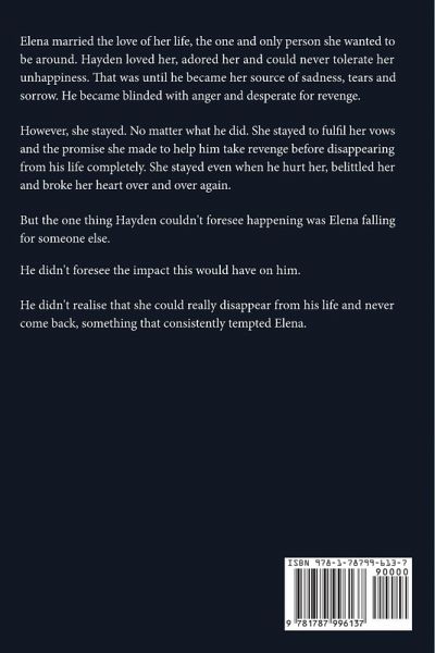 Elena married the love of her life, the one and only person she wanted to be around. Hayden loved her, adored her and could never tolerate her unhappiness. That was until he became her source of sadness, tears and sorrow. He became blinded with anger and desperate for revenge. However, she stayed. No matter what he did. She stayed to fulfil her vows and the promise she made to help him take revenge before disappearing from his life completely. She stayed even when he hurt her, belittled her and broke her heart over and over again. But the one thing Hayden couldn't foresee happening was Elena falling for someone else. He didn't foresee the impact this would have on him. He didn't realise that she could really disappear from his life and never come back, something that consistently tempted Elena.