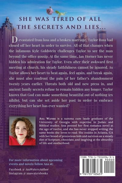 Taylor Ross fends off the attention of the office bad boy as well as the duller than paint drying guy from church. She soon discovers how wrong she is about both of them. Devastated from loss and a broken marriage, Taylor Ross had closed off her heart in order to survive. All of that changes when the infamous Kyle Goldstein challenges Taylor to see the man beyond the office gossip. At the same time, Ian Horner has never hidden his admiration for Taylor. Even after their awkward first meeting at church, his steady faithfulness cannot be ignored. As Taylor allows her heart to beat again, feel again, and break again, she must also confront the pain of her father's abandonment twenty years earlier. Threats both old and new press in, and ancient family secrets refuse to remain hidden any longer. Taylor knows that God can make something beautiful out of nothing (ex nihilo), but can she set aside her past in order to embrace everything her heart has ever wanted? Tropes:Opposites Attract Bad Boy vs Good Guy Love After Divorce Makeover Found Family