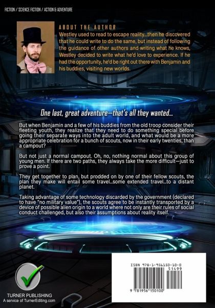 One last, great adventure-that's all they wanted... But when Benjamin and a few of his buddies from the old troop consider their fleeting youth, they realise that they need to do something special before going their separate ways into the adult world, and what would be a more appropriate celebration for a bunch of scouts, now in their early twenties, than a campout? But not just a normal campout. Oh, no, nothing normal about this group of young men. If there are two paths, they always take the more difficult-just to prove a point. They get together to plan, but prodded on by one of their fellow scouts, the plan they make will entail some travel...some extended travel...to a distant planet. Taking advantage of some technology discarded by the government (declared to have "no military value"), the scouts agree to be instantly transported by a device of possible alien origin to a world where not only are their rules of social conduct challenged, but also their assumptions about reality itself.