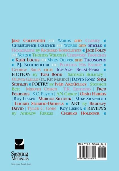 The Discerning Mollusk's Guide to Arts and Ideas. Contributions by Iván Argüelles, Stephen Bett, P.J. Blumenthal, Tori Bond, Christopher Boucher, Samson Bulkley, Marvin Cohen, Bradley David, T.K. Edmond, Andrew Farkas, Fred Ferraris, S.C. Flynn, Jack Foley, Olivia Gallo, Jake Goldsmith, Tyler C. Gore, AN Grace, Oisín Harris, Charles Holdefer, Richard Kostelanetz, Roy Lisker, Kurt Luchs, Kit Maude, David Rose, George Salis, Shya Scanlon, Marcus Silcock, Mike Silverton, Lucian Staiano-Daniels, and Thomas Walton.