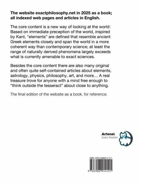 The website exactphilosophy.net in 2025 as a book; all indexed web pages and articles in English. The core content is a new way of looking at the world: Based on immediate preception of the world, inspired by Kant, "elements" are defined that resemble ancient Greek elements closely and span the world in a more coherent way than contemporary science; at least the range of naturally derived phenomena largely exceeds what is currently amenable to exact sciences. Besides the core content there are also many original and often quite self-contained articles about elements, astrology, physics, philosophy, art, and more... A real treasure trove for anyone with a mind free enough to "think outside the tesseract" about close to anything. The final edition of the website as a book, for reference.