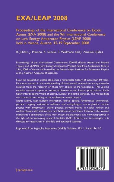 Now the research in exotic atoms has a remarkable history of more than 50 years. Enormous success in the understanding of fundamental interactions and symmetries resulted from the research on these tiny objects at the femtoscale. This volume contains research papers on recent achievements and future opportunities of this highly interdisciplinary field of atomic, nuclear, and particle physics. The Proceedings are structured according to the conference session topics: exotic atoms, kaon-nucleon interaction, exotic decays, fundamental symmetries, particle trapping, antiproton collisions and antihydrogen, muon physics, nuclear physics with antiprotons, charm physics, baryons bound in nuclei, hadron and nuclear physics with antiprotons, new facilities and new ideas. Therefore, this volume represents a compilation of the most recent developments and new perspectives in the light of the upcoming research facilities (FAIR, J-PARC) and technologies. It is directed to researchers in the field and advanced students.