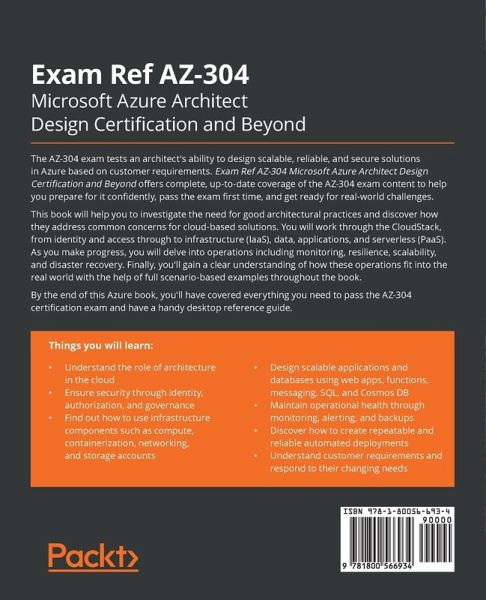 Master the Microsoft Azure platform and prepare for the AZ-304 certification exam by learning the key concepts needed to identify key stakeholder requirements and translate these into robust solutions Key Features:Build secure and scalable solutions on the Microsoft Azure platform Learn how to design solutions that are compliant with customer requirements Work with real-world scenarios to become a successful Azure architect, and prepare for the AZ-304 exam Book Description: The AZ-304 exam tests an architect's ability to design scalable, reliable, and secure solutions in Azure based on customer requirements. Exam Ref AZ-304 Microsoft Azure Architect Design Certification and Beyond offers complete, up-to-date coverage of the AZ-304 exam content to help you prepare for it confidently, pass the exam first time, and get ready for real-world challenges. This book will help you to investigate the need for good architectural practices and discover how they address common concerns for cloud-based solutions. You will work through the CloudStack, from identity and access through to infrastructure (IaaS), data, applications, and serverless (PaaS). As you make progress, you will delve into operations including monitoring, resilience, scalability, and disaster recovery. Finally, you'll gain a clear understanding of how these operations fit into the real world with the help of full scenario-based examples throughout the book. By the end of this Azure book, you'll have covered everything you need to pass the AZ-304 certification exam and have a handy desktop reference guide. What You Will Learn:Understand the role of architecture in the cloud Ensure security through identity, authorization, and governance Find out how to use infrastructure components such as compute, containerization, networking, and storage accounts Design scalable applications and databases using web apps, functions, messaging, SQL, and Cosmos DB Maintain operational health through monitoring, alerting, and backups Discover how to create repeatable and reliable automated deployments Understand customer requirements and respond to their changing needs Who this book is for: This book is for Azure Solution Architects who advise stakeholders and help translate business requirements into secure, scalable, and reliable solutions. Junior architects looking to advance their skills in the Cloud will also benefit from this book. Experience with the Azure platform is expected, and a general understanding of development patterns will be advantageous.