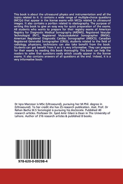 This book is about the ultrasound physics and instrumentation and all the topics related to it. It contains a wide range of multiple-choice questions (MCQs) that appear in the license exams with MCQs related to ultrasound images. It also contains a portion related to elastography. The purpose of writing this book to give an easy way for quick preparation of the exams. All students who wants to prepare for their registry exams of American Registry for Diagnostic Medical Sonography (ARDMS), Registered Vascular Technologist (RVT), Registered Musculoskeletal Sonographer (RMSK), American Registered Diagnostic Cardiac Sonographer (ARDCS), Canadian Registered Generalist Sonographer (CRGS), students related to the field of radiology, physicians, technicians can also take benefit from the book. Students can get benefit from it as it is very informative. They can prepare for their exams by reading this book thoroughly. This book can help the readers to solve that questions easily which usually appear in the license exams. It also contains answers of all questions at the end. Indeed, it is a very informative book.