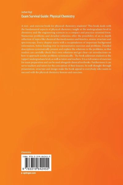 A text- and exercise book for physical chemistry students! This book deals with the fundamental aspects of physical chemistry taught at the undergraduate level in chemistry and the engineering sciences in a compact and practice-oriented form. Numerous problems and detailed solutions offer the possibility of an in-depth reflection of topics like chemical thermodynamics and kinetics, atomic structure and spectroscopy. Every chapter starts with a recapitulation of important background information, before leading over to representative exercises and problems. Detailed descriptions systematically present and explain the solutions to the problems, so that readers can carefully check their own solutions and get clear-cut introductions on how to approach similar problems systematically.