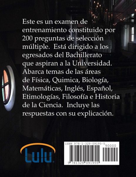 Este es un examen de entrenamiento constituido por 200 preguntas de selección múltiple. Está dirigido a los egresados del Bachillerato que aspiran a la Universidad. Abarca temas de las áreas de Física, Quimica, Biología, Matemáticas, Inglés, Español, Etimologías, Filosofía e Historia de la Ciencia. Incluye las respuestas con su explicación. Es una herramienta segura para mejorar sus resultados en el examen de admisión de cualquier universidad de habla hispana.