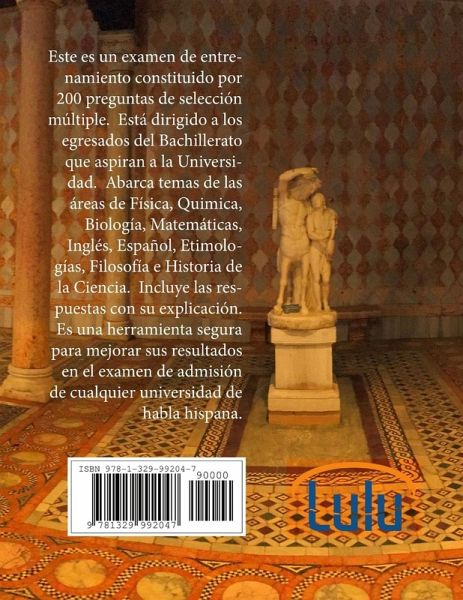 Este es un examen de entrenamiento constituido por 200 preguntas de selección múltiple. Está dirigido a los egresados del Bachillerato que aspiran a la Universidad. Abarca temas de las áreas de Física, Quimica, Biología, Matemáticas, Inglés, Español, Etimologías, Filosofía e Historia de la Ciencia. Incluye las respuestas con su explicación. Es una herramienta segura para mejorar sus resultados en el examen de admisión de cualquier universidad de habla hispana.