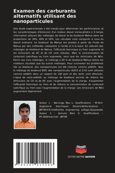 Une étude expérimentale a été menée pour déterminer les performances et les caractéristiques d'émission d'un moteur diesel monocylindre à 4 temps informatisé utilisant des mélanges de diesel et de biodiesel Mahua dans les proportions de 30%, 40% et 50%. Les résultats sont comparés à ceux du diesel ordinaire. Le biodiesel de Mahua est produit à partir de l'huile de Mahua par des méthodes catalysées à l'acide et à la base. En utilisant des mélanges de biodiesel de Mahua, l'efficacité thermique au frein augmente et les émissions de HC et de CO sont réduites. Mais la consommation de carburant spécifique au frein augmente, ainsi que les émissions de NOx. Parmi ces trois mélanges, le mélange à 50 % de biodiesel Mahua donne les meilleurs résultats que les autres mélanges. Pour surmonter les problèmes liés au biodiesel, des nanoparticules ont été choisies comme additifs. Avec le mélange de biodiesel B50, des nanoparticules Al2O3 et ZnO sont utilisées comme additifs dans un rapport de 100 ppm et des tests sont effectués. L'ajout de nano-additifs au mélange de biodiesel permet de réduire les émissions de CO et de HC avec l'augmentation de la charge, d'augmenter l'efficacité thermique au frein et de réduire la consommation de carburant spécifique au frein avec l'augmentation de la charge. Les émissions de NOx augmentent légèrement.