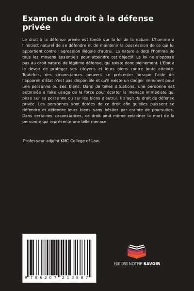 Le droit à la défense privée est fondé sur la loi de la nature. L'homme a l'instinct naturel de se défendre et de maintenir la possession de ce qui lui appartient contre l'agression illégale d'autrui. La nature a doté l'homme de tous les moyens essentiels pour atteindre cet objectif. La loi ne s'oppose pas au droit naturel de légitime défense, qui existe donc pleinement. L'État a le devoir de protéger ses citoyens et leurs biens contre toute atteinte. Toutefois, des circonstances peuvent se présenter lorsque l'aide de l'appareil d'État n'est pas disponible et qu'il existe un danger imminent pour une personne ou ses biens. Dans de telles situations, une personne est autorisée à faire usage de la force pour écarter la menace immédiate qui pèse sur sa personne ou sur les biens d'autrui. Il s'agit du droit de défense privée. Les personnes sont dotées de ce droit afin qu'elles puissent se défendre et défendre leurs biens sans hésiter par crainte de poursuites. Dans certaines circonstances, ce droit peut même entraîner la mort de la personne qui représente une telle menace.