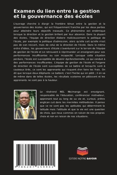 L'ouvrage cherche à élargir la frontière ténue entre la gestion et la gouvernance des écoles, qui est fréquemment franchie par les deux parties pour atteindre leurs objectifs inavoués. Ce phénomène est endémique lorsque la direction et la gestion brillent par leur absence. Dans la plupart des écoles, l'équipe de direction élabore malicieusement la politique de l'école, par exemple la politique d'admission, alors qu'elle sait qu'elle n'est pas de son ressort, mais de celui de la direction de l'école. Dans le même ordre d'idées, les gouverneurs d'école s'aventurent sur le terrain de l'équipe de gestion de l'école et se retrouvent à réprimander un enseignant pour ses performances insuffisantes ou son incapacité. Lorsque cette situation perdure, l'école est susceptible de devenir dysfonctionnelle, ce qui conduit à des performances insuffisantes. L'équipe de gestion de l'école et l'organe de direction de l'école sont susceptibles de se battre et lorsqu'ils sont à couteaux tirés, ce sont les apprenants qui risquent d'en faire les frais. On dit que lorsque deux éléphants se battent, c'est l'herbe qui en pâtit ; il en va de même dans de telles écoles, les résultats scolaires en pâtissent et les apprenants ne sont pas à la hauteur.