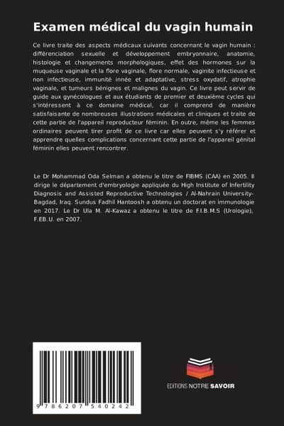 Ce livre traite des aspects médicaux suivants concernant le vagin humain : différenciation sexuelle et développement embryonnaire, anatomie, histologie et changements morphologiques, effet des hormones sur la muqueuse vaginale et la flore vaginale, flore normale, vaginite infectieuse et non infectieuse, immunité innée et adaptative, stress oxydatif, atrophie vaginale, et tumeurs bénignes et malignes du vagin. Ce livre peut servir de guide aux gynécologues et aux étudiants de premier et deuxième cycles qui s'intéressent à ce domaine médical, car il comprend de manière satisfaisante de nombreuses illustrations médicales et cliniques et traite de cette partie de l'appareil reproducteur féminin. En outre, même les femmes ordinaires peuvent tirer profit de ce livre car elles peuvent s'y référer et apprendre quelles complications concernant cette partie de l'appareil génital féminin elles peuvent rencontrer.