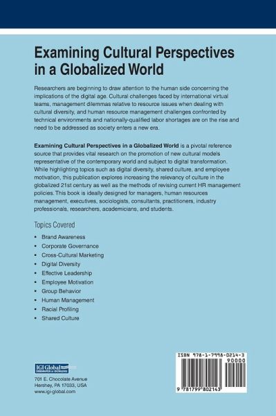 Researchers are beginning to draw attention to the human side concerning the implications of the digital age. Cultural challenges faced by international virtual teams, management dilemmas relative to resource issues when dealing with cultural diversity, and human resource management challenges confronted by technical environments and nationally-qualified labor shortages are on the rise and need to be addressed as society enters a new era. Examining Cultural Perspectives in a Globalized World is a pivotal reference source that provides vital research on the promotion of new cultural models representative of the contemporary world and subject to digital transformation. While highlighting topics such as digital diversity, shared culture, and employee motivation, this publication explores increasing the relevancy of culture in the globalized 21st century as well as the methods of revising current HR management policies. This book is ideally designed for managers, human resources management, executives, sociologists, consultants, practitioners, industry professionals, researchers, academicians, and students.