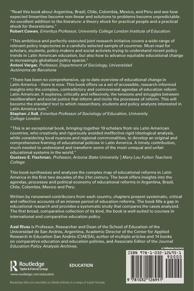 This book synthesizes and analyzes the complex map of educational reforms in Latin America in the first two decades of the 21st century. The book offers insights into the agendas, processes and political economy of educational reforms in Argentina, Brazil, Chile, Colombia, Mexico and Peru. Written by renowned contributors from each country, chapters present systematic, critical and reflective accounts of an intense period of education reforms. The book fills a gap in educational research and provides a systematic study that compares the cases analyzed. The first broad, comparative collection of its kind, the book is well-suited to courses in international and comparative education policy.