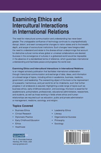 The need for intercultural communication and understanding has never been greater. The unstoppable confluence of technology continues to unsympathetically disrupt, distort, and exert consequential changes to nation states and to the breadth, depth, and scope of sociocultural institutions. Such changes have foregrounded the need to understand and relate to the diverse ethical underpinnings that account for distinctive cultural norms where global or universal collaborations are desired. Success in the convergence of cultures in a globalized world would be impossible in the absence of a standardized terms of reference, which guarantees international understanding and facilitates peace and progress the world over. Examining Ethics and Intercultural Interactions in International Relations is an integral scholarly publication that facilitates international collaboration through intercultural communication and exchange of data, ideas, and information on a broad range of topics, including ethics in academics, business, medicine, government, and leadership. The overarching object of this book is the improvement of a peaceful, harmonious, and just world for all its inhabitants, such that further progress in all endeavors is assured. Highlighting a wide range of topics such as business ethics, early childhood education, and sociology, this book is essential for academicians, policymakers, professionals, educational administrators, researchers, and students, as well as those working in fields where ethics and human relationships are required such as education, public and private administration or management, medicine, sociology, and religion.