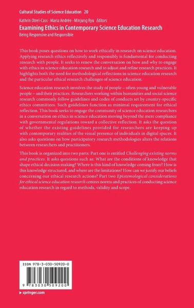 Chapter 1. Being responsive (Kathrin Otrel-Cass, Maria Andrée & Minjung Ryu).- Part I: Challenging existing norms and practices.- Chapter 2. The relevance of relevance for research ethics (Antje Gimmler).- Chapter 3. Reflections on research ethics in historically oriented science education research in Canada (John Allison & Michaela Vogt).- Chapter 4. Science education practices: Analyzing values and knowledge when conducting educational research (Gerd Johansen & Trine Anker).- Chapter 5. Ethical considerations in ethnographies of science education: Toward humanizing science education research (Minjung Ryu).- Chapter 6. Sex Education: Normativity and ethical considerations through three lenses (Auli Arvola Orlander & Iann Lundegård).- Chapter 7. Challenging existing norms and practices: Ethical thinking at the science education research boundaries (Jaume Ametller).- Part II: Epistemological considerations for ethical science education research.- Chapter 8. Ethical challenges of symmetry in participatory science education research: Proposing a heuristic for ethical reflection (Maria Andrée, Kerstin Dankwardt-Lillieström, & Jonna Wiblom).- Chapter 9. Living authenticity in science education research (Jennifer Adams & Christina Siry).- Chapter 10. Beyond dichotomies/binaries: 21st century post humanities ethics for science education using a Baradian perspective (Kathryn Scantlebury & Catherine Milne).- Chapter 11. Students' ethical agency in video research (Jaakko Hilppö & Reed Stevens).- Chapter 12. The performativity of ethics in visual science education research: Using a material ethics approach (Kathrin Otrel-Cass).- Chapter 13. Methodological ethics considerations in science education research: Symmetric, authentic, material, adaptive, and multidisciplinary (Martin Riopel).- Index.