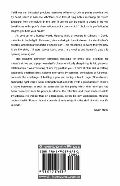 "If stillness can be tasted, precious memories will return, such as poetry once learned by heart, which in Maurice Whelan's case told of King Arthur receiving his sword Excalibur from the maiden in the lake. If silence can be heard, a poetry in life will breathe, as in this poet's observation about a dawn which '…holds / its perfection/as long/as you hold your breath'. As contrast to a hurried world, Maurice finds a treasury in stillness - Gaelic melodies in the twilight of his mind, his wandering in the slipstream of a silent father's dreams, and from a wonderful 'Perfect Pitch' - his reassuring knowing that 'the bow is on the string / fingers caress keys, eyes / are closing and heaven's gate / is opening once again'. This beautiful anthology combines nostalgia for times past, gratitude for nature's riches and a psychoanalyst's characteristically sharp insights into personal relationships: 'I wasn't staring / I saw my youth in you. / That's all.' His skill in crafting apparently effortless lines, seldom interrupted by commas, semicolons or full stops, conceals the challenge of holding a pen and facing a blank page. 'Sometimes / finding the right word / is like drilling through concrete / with a jackhammer.' There's a brave frankness in such an admission but the poetry which then emerges has been conceived from the peace in silence, the reflection and recall made possible by stillness. No wonder that, on a front page, before his own work begins, Maurice quotes Hazlitt: 'Poetry…is not a branch of authorship: it is the stuff of which our life is made.'" - Stuart Rees