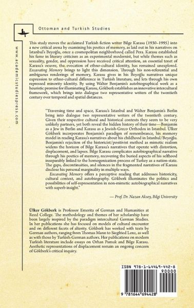 Table of Contents Acknowledgments Introduction 1. Beginnings: Reading Memory 2. From Berlin s Old West to Istanbul s Beyölu: Narratives of Memory, Narratives of Lost Topographies 3. Incompleteness as Anti-Autobiography: The Production and Publication Histories of Benjamin s and Karasu s Memory Narratives 4. Bilge Karasu in Historical Context: Identity Formation in the Shadow of Turkification 5. Forgetting, Remembering, and the Workings of Collective Memory: Survival and the Retrieval of Memory Traces 6. Dialectical Images in Beyölu s Black Waters: The Photograph as Testimony 7. Remembering as Distortion: Visual and Aural Traces of Alterity 8. Spatiality as the Inscription of the Past 9. Crazy Meryem as the Saint of Beyölu s Marginalized: Toward a Final Reading of Difference Conclusion Addendum: Biographical Notes on Bilge Karasu References Index