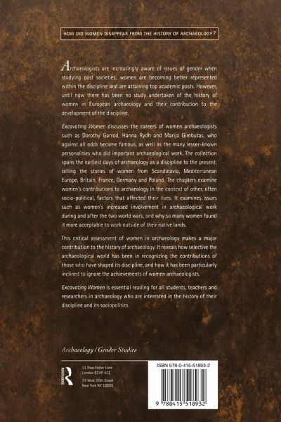 Excavating Women discusses the careers of women archaeologists such as Dorothy Garrod, Hanna Rydh and Marija Gimbutas, who against all odds became famous, as well as the many lesser-known personalities who did important archaeological work. The collection spans the earliest days of archaeology as a discipline to the present, telling the stories of women from Scandinavia, Mediterranean Europe, Britain, France, Germany and Poland. The chapters examine women's contributions to archaeology in the context of other, often socio-political, factors that affected their lives. It examines issues such as women's increased involvement in archaeological work during and after the two World Wars, and why so many women found it more acceptable to work outside of their native lands.