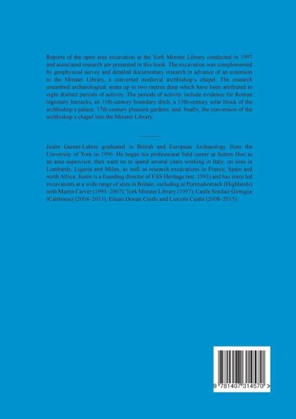 Reports of the open area excavation at the York Minster Library conducted in 1997 and associated research are presented in this book. The excavation was complemented by geophysical survey and detailed documentary research in advance of an extension to the Minster Library, a converted medieval archbishop's chapel. The research unearthed archaeological strata up to two metres deep which have been attributed to eight distinct periods of activity. The periods of activity include evidence for Roman legionary barracks, an 11th-century boundary ditch, a 13th-century solar block of the archbishop's palace, 17th-century pleasure gardens, and, finally, the conversion of the archbishop's chapel into the Minster Library. With contributions by Craig Barclay, Paul Bidwell, Martin Carver, Jonathan Clark, Hilary Cool, Brenda Dickinson, Sandra Garside-Neville, Kate Giles, Kay Hartley, Deborah Jaques, Patrick Ottaway, Barbara Precious, Nicky Rogers, Jennie Stopford, Alan Vince and Felicity Ward.