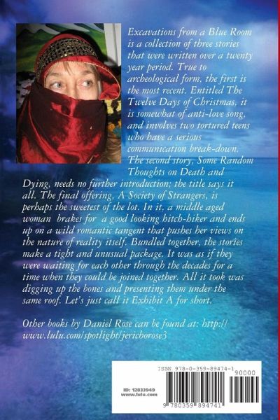 Excavations from a Blue Room is a collection of three stories that were written over a twenty year period. True to archaeological form, the first is the most recent. Entitled The Twelve Days of Christmas, it is somewhat of anti-love song, and involves two tortured teens who have a serious communication break-down. The second story, Some Random Thoughts on Death and Dying needs no further introduction; the title says it all. The final offering, A Society of Strangers, is perhaps the sweetest of the lot. In it, a middle aged woman brakes for a good looking hitch-hiker and ends up on a wild romantic tangent that pushes her views on the nature of reality itself. Bundled together, the stories make a tight and unusual package. It was as if they were waiting for each other through the decades for the time when they could be joined together. All it took was digging up the bones and presenting them under the same roof. Let's just call it Exhibit A for short.