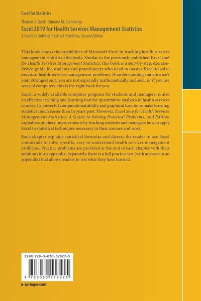 Each chapter explains statistical formulas and directs the reader to use Excel commands to solve specific, easy-to-understand health services management problems. Practice problems are provided at the end of each chapter with their solutions in an appendix. Separately, there is a full practice test (with answers in an appendix) that allows readers to test what they have learned.