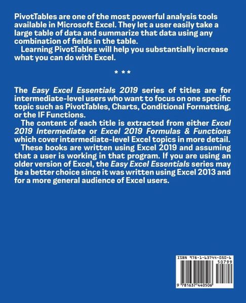 PivotTables are one of the most powerful analysis tools available in Microsoft Excel. They let a user easily take a large table of data and summarize that data using any combination of fields in the table.¿ Learning PivotTables will help you substantially increase what you can do with Excel. * * * The Easy Excel Essentials 2019 series of titles are for intermediate-level users who want to focus on one specific topic such as PivotTables, Charts, Conditional Formatting, or the IF Functions.¿ The content of each title is extracted from either Excel 2019 Intermediate or Excel 2019 Formulas & Functions which cover intermediate-level Excel topics in more detail.¿ These books are written using Excel 2019 and assuming that a user is working in that program. If you are using an older version of Excel, the Easy Excel Essentials series may be a better choice since it was written using Excel 2013 and for a more general audience of Excel users.