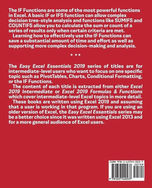 The IF Functions are some of the most powerful functions in Excel. A basic IF or IFS function can allow complex decision tree-style analysis and functions like SUMIFS and COUNTIFS allow you to calculate the sum or count of a series of results only when certain criteria are met.¿ Learning how to effectively use the IF Functions can save a substantial amount of time and effort as well as supporting more complex decision-making and analysis. * * * The Easy Excel Essentials 2019 series of titles are for intermediate-level users who want to focus on one specific topic such as PivotTables, Charts, Conditional Formatting, or the IF Functions.¿ The content of each title is extracted from either Excel 2019 Intermediate or Excel 2019 Formulas & Functions which cover intermediate-level Excel topics in more detail.¿ These books are written using Excel 2019 and assuming that a user is working in that program. If you are using an older version of Excel, the Easy Excel Essentials series may be a better choice since it was written using Excel 2013 and for a more general audience of Excel users.