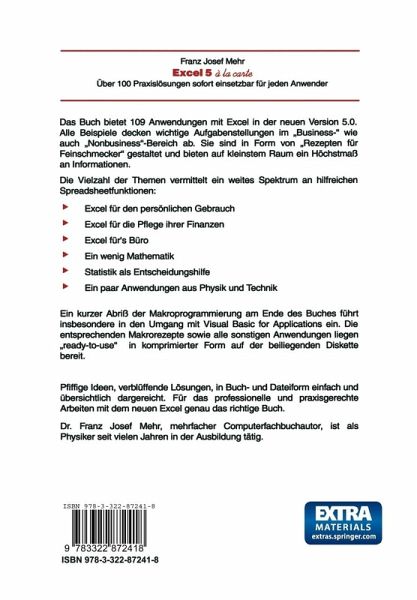 Das Buch bietet 109 Anwendungen mit Excel in der neuen Version 5.0. Alle Beispiele decken wichtige Aufgabenstellungen im "Business-" wie auch "Nonbusiness"-Bereich ab. Sie sind in Form von "Rezepten für Feinschmecker" gestaltet und bieten auf kleinstem Raum ein Höchstmaß an Informationen. Die entsprechenden Makrorezepte sowie alle sonstigen Anwendungen liegen "ready-to-use" in komprimierter Form auf der beiliegenden Diskette bereit. Pfiffige Ideen und verblüffende Lösungen werden in Buch- und Dateiform einfach und übersichtlich dargereicht. Für das professionelle und praxisgerechte Arbeiten mit dem neuen Excel genau das richtige Buch.